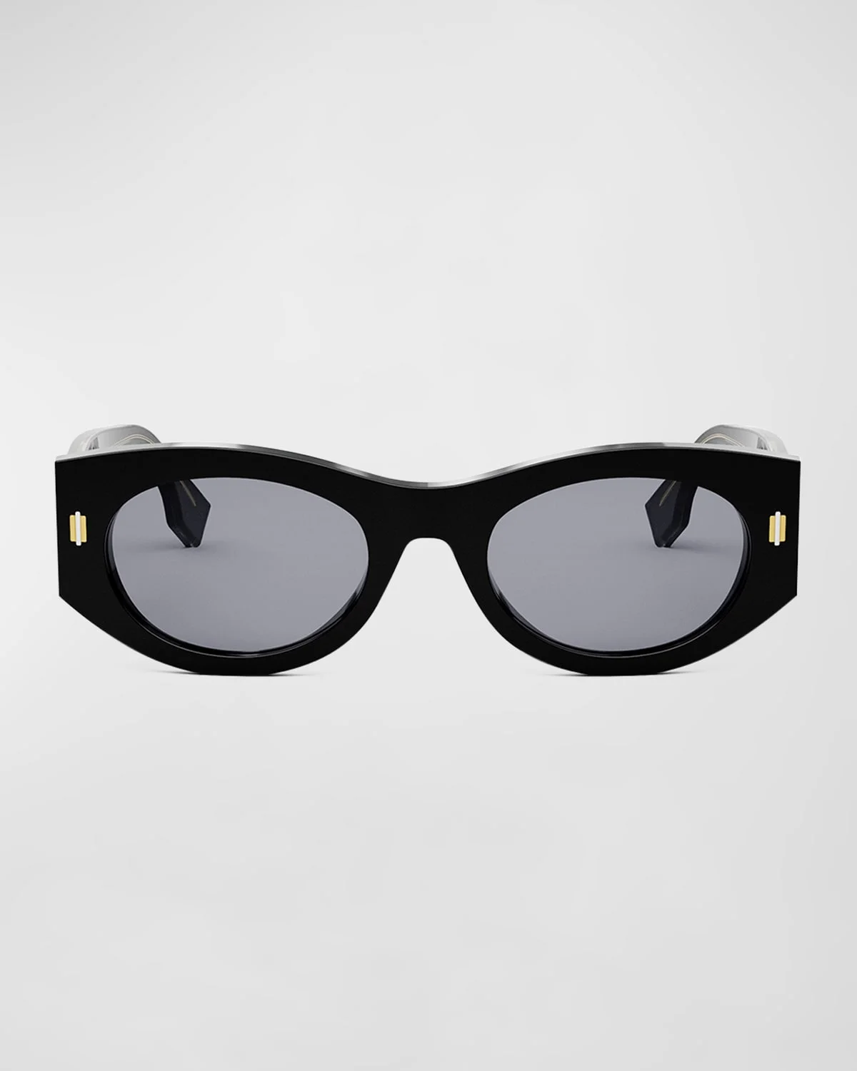 - Fendi "Roma" shield sunglasses in acetate - Eye/bridge/temple (in mm): 0-0-145 - Solid lenses - Saddle nose bridge - Wide, tapered arms; logo on sides - Acetate/nylon/polyamide - Hand wash - 100% UVA/UVB protection - Made in Italy - Proposition 65 warning for California residents