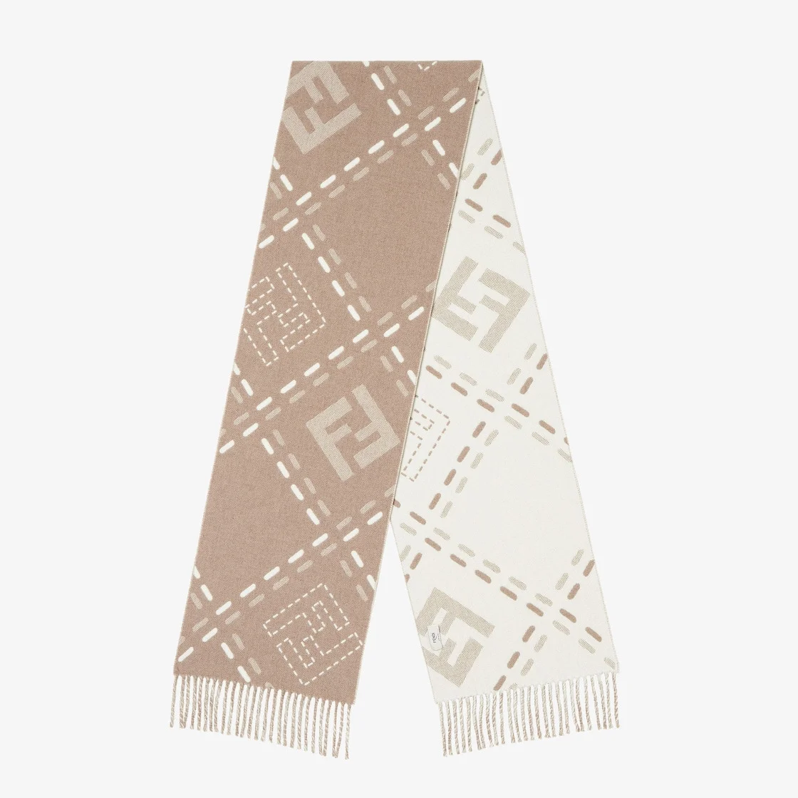 Long scarf finished with fringing. Made of dove gray wool with a jacquard Selleria Macro Check stitching motif, inspired by the iconic Fendi workmanship, and FF logo interpreted in two different contrasting graphic textures. Made in Italy Composition: 100% wool Product Code: FXT462AYKUF0QD3
