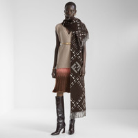 Long scarf finished with fringing. Made of dark brown wool with a jacquard Selleria Macro Check stitching motif, inspired by the iconic Fendi workmanship, and FF logo interpreted in two different contrasting graphic textures. Made in Italy Composition: 100% wool Product Code: FXT462AYKUF1U6N