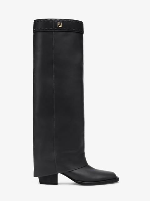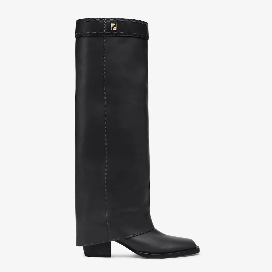 Square toe boots with tubular leg. Handmade in black leather. The leg partially covers the heel creating a trompe l'oeil effect and soft creases on the front. FF strap at the knee, finished with hand-sewn tone-on-tone macro Selleria topstitches, an emblem of the iconic Selleria workmanship handed down through generations of Fendi artisans since 1925. Made in Italy Composition: 100% calf leather, inside: 100% calf leather Product Code: 8W8566NA7F0QA1