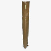 Thigh-high boots with square toe and tubular leg. Handmade in shiny, green leather. The leg partially covers the heel creating a trompe l'oeil effect and soft creases on the front. FF strap at the knee, finished with hand-sewn tone-on-tone macro Selleria topstitches, an emblem of the iconic Selleria workmanship handed down through generations of Fendi artisans since 1925. Made in Italy Composition: 100% calf leather, inside: 100% calf leather Product Code: 8W8565NA7F07G8
