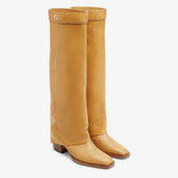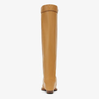 Square toe boots with tubular leg. Handmade in light beige leather. The leg partially covers the heel creating a trompe l'oeil effect and soft creases on the front. FF strap at the knee, finished with hand-sewn tone-on-tone macro Selleria topstitches, an emblem of the iconic Selleria workmanship handed down through generations of Fendi artisans since 1925. Made in Italy Composition: 100% calf leather, inside: 100% calf leather Product Code: 8W8566NA7F0FME