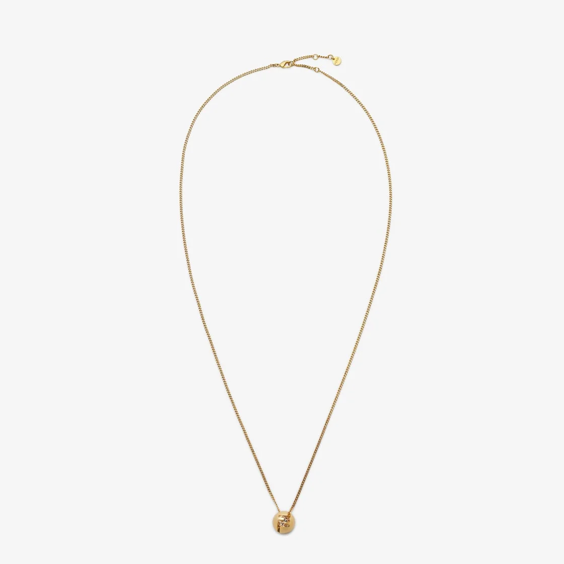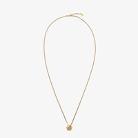 Chain necklace with Fendi Sphera element and inserted crystal. Small clip fastening and logo nameplate. Made of gold-finish metal. Made in Italy Composition: 100% bronze, 100% synthetic stone Product Code: 8AL133ATEPF1UDD Product Care: The product you have purchased may be embellished with a precious metal top or varnish and may also feature appliques, gemstones (in various shades of the same color), crystals, plexiglass or resin. The mixture of materials and the special details give this product its unique character. To best maintain the product’s appearance over time, avoid contact with sea water, spa water, lacquers, perfumes, solvents, chemicals and abrasive materials. If necessary, clean with water and a neutral soap and/or polish with a dry microfiber cloth.