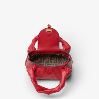 Mini Fendi Spy Bag, a contemporary reinterpretation of a famous Fendi It bag presented in the Spring Summer 2005 Fashion Show, distinguished by its unique and unmistakable design. An expression of fine craftsmanship, it features distinctive twisted handles that embellish the silhouette. Made of red calfskin. Rounded flap with clasp and knotted tie in tone-on-tone leather. Gold-colored hot-stamped FENDI ROMA logo. Featuring a tobacco-brown FF jacquard fabric-lined internal compartment and gold-finish metalware. The bag can be carried by hand, or worn either on the shoulder or cross-body thanks to the adjustable, detachable shoulder strap. Holds a 6.7-inch smartphone, Mini Trifold card holder or wallet, keys and lipstick. Made in Italy Composition: 100% calfskin, inside: 64% polyester, 23% cotton, 13% polyurethane Product Code: 8BS110AYCTF0V3L