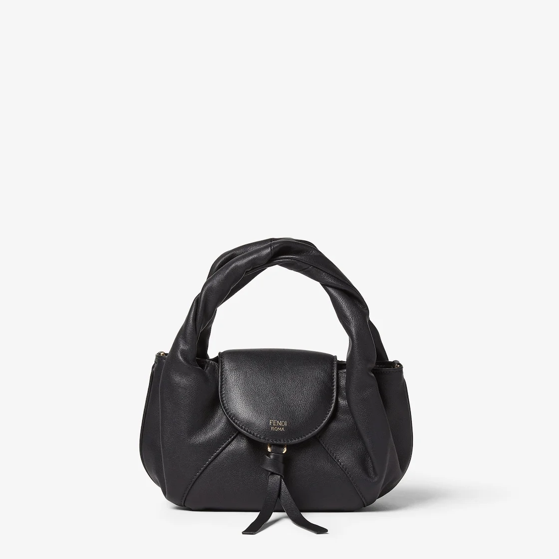 Mini Fendi Spy Bag, a contemporary reinterpretation of a famous Fendi It bag presented in the Spring Summer 2005 Fashion Show, distinguished by its unique and unmistakable design. An expression of fine craftsmanship, it features distinctive twisted handles that embellish the silhouette. Made of black calfskin. Rounded flap with clasp and knotted tie in tone-on-tone leather. Gold-colored hot-stamped FENDI ROMA logo. Featuring a tobacco-brown FF jacquard fabric-lined internal compartment and gold-finish metalware. The bag can be carried by hand, or worn either on the shoulder or cross-body thanks to the adjustable, detachable shoulder strap. Holds a 6.7-inch smartphone, Mini Trifold card holder or wallet, keys and lipstick. Made in Italy Composition: 100% calfskin, inside: 64% polyester, 23% cotton, 13% polyurethane Product Code: 8BS110AYCTF0KUR
