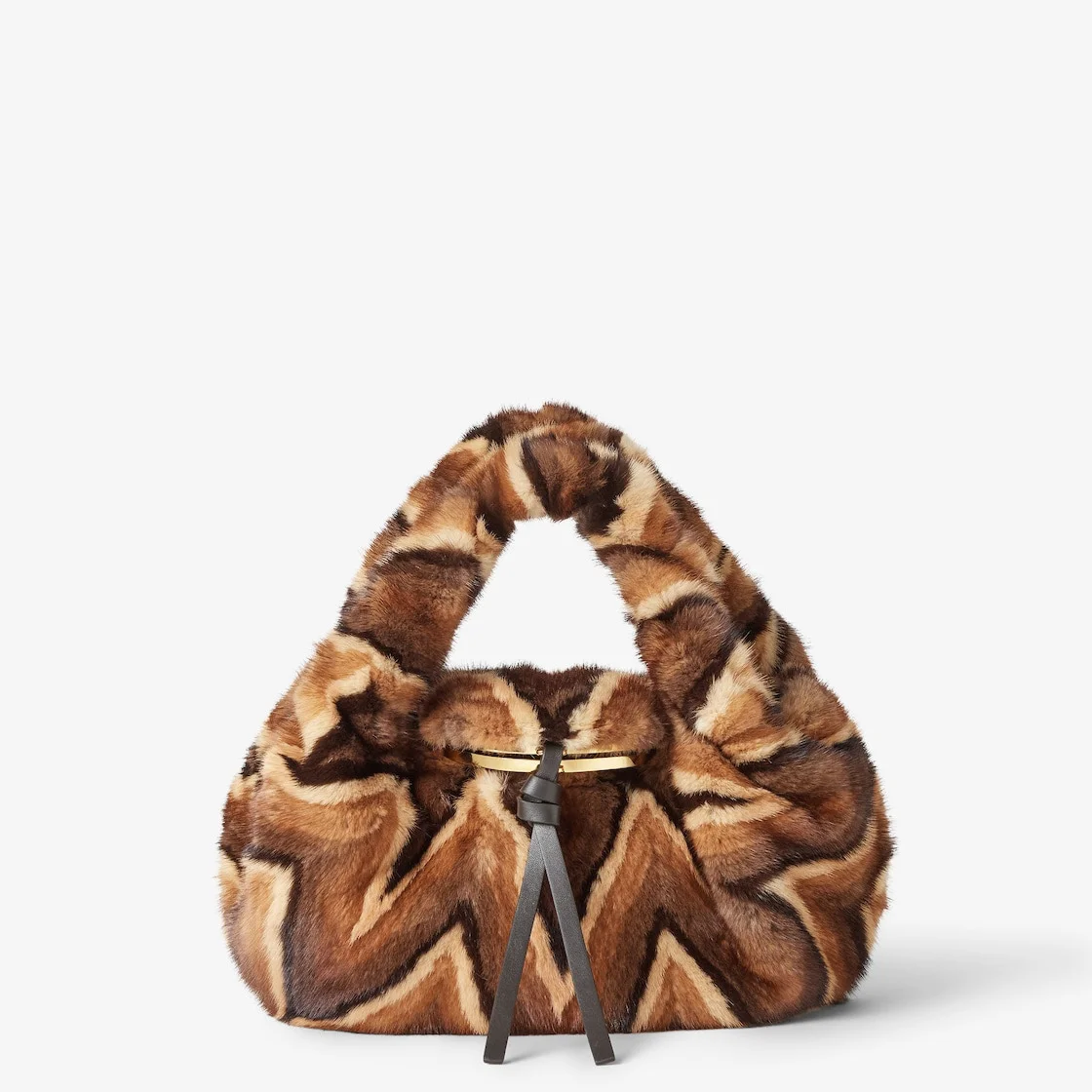 Small Fendi Spy Bag, a contemporary reinterpretation of a famous Fendi It bag presented in the Spring Summer 2005 Fashion Show, distinguished by its unique and unmistakable design. The name is inspired by the bag’s features, which include a secret pocket hidden in the flap that can be opened with a small button. An expression of fine craftsmanship, it features distinctive twisted handles that embellish the silhouette. Made of soft mink inlaid to create a chevron motif in beige, brown and black with natural nuances. The round flap closure conceals a coin pocket and is trimmed in metal and has a knotted strap in tone-on-tone leather. Featuring a black suede-lined interior and gold-finish metal accessories. The bag can be carried by hand or worn cross-body with the adjustable, detachable black calfskin shoulder strap. Made in Italy Composition: 100% mink fur, interior: 100% calfskin Product Code: 8BR838AYCWF1TDQ