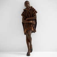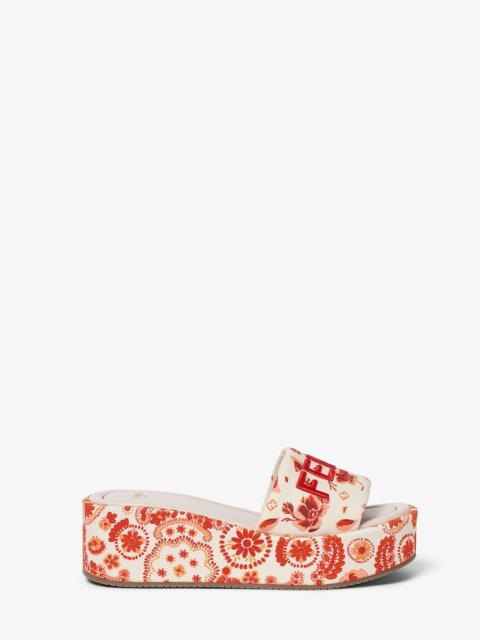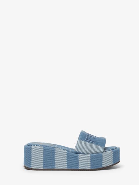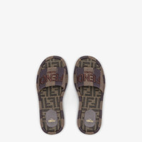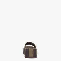 Wide-band slides with a platform sole. Made of fabric with brown Pequin stripes. Jacquard footbed with the iconic FF motif in the same shades. Brown thread Fendi Roma embroidery. Made in Italy Measurements: - Heel height : 65 mm Composition: 100% cotton, decoration: 100% polyester, inside: 100% calf leather Product Code: 8R8515AORHF1P95