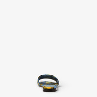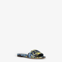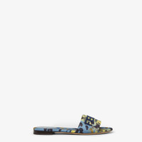 Wide-band slides. Made of light blue silk printed with the multicolored Dew Drops pattern. Tone-on-tone silk insole. Blue yarn Fendi Roma embossed embroidery. Made in Italy Composition: 100% silk, inside: 100% calfskin Product Code: 8R8092AWD8F1V99