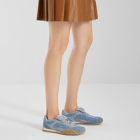 Fendi Wave Pulse lace-up low-top sneakers. Made of light blue suede and denim with and tone-on-tone suede-effect printed details. Inserts and folded tongue made of the same material. Light blue melange tubular laces. Three-dimensional rubber logo on the side and gold-colored metal Fendi logo on the tongue. Beige rubber running sole with wraparound edge on the side and diagonal F motif. Made in Italy Composition: 100% calfskin, inside: 100% lambskin Product Code: 8E8820AYFDF1TZ6