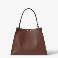 Medium Fendi Way bag, presented at the Spring Summer 2026 Fashion Show. Distinguished by a soft, generously sized silhouette, embellished with the iconic twist lock. Made of low-sheen dark brown calfskin. Featuring an internal compartment lined in violet suede, tone-on-tone calfskin inner pocket and gold-finish metalware. Can be carried by hand or worn on the shoulder thanks to the long adjustable handle, embellished with a small ring to attach charms. Holds a tablet, large wallet and other small accessories such as keys and headphones. Made in Italy Composition: 100% calfskin, inside: 100% calfskin Product Code: 8BN368AWPFF1V0F