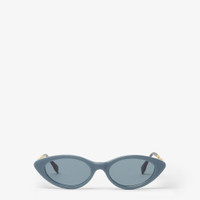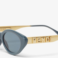 Fendigraphy sunglasses with elongated cat-eye front in denim blue acetate. Large gold-color metal temples, decorated with three-dimensional Fendi Roma lettering and acetate tips matching the front. Blue lenses. Made in Italy Composition: 100% plastic, 100% metal Product Code: FOL137V1WF1VQD Product Care: Wash your eyeglasses every day with warm water and a pH-neutral soap.Do not use alcohol, aggressive chemical products or disinfectant wipes and do not dry them with paper or other fabrics that could scratch them or leave streaks.Dry with a clean microfiber cloth.After use, always keep your eyeglasses in their case.