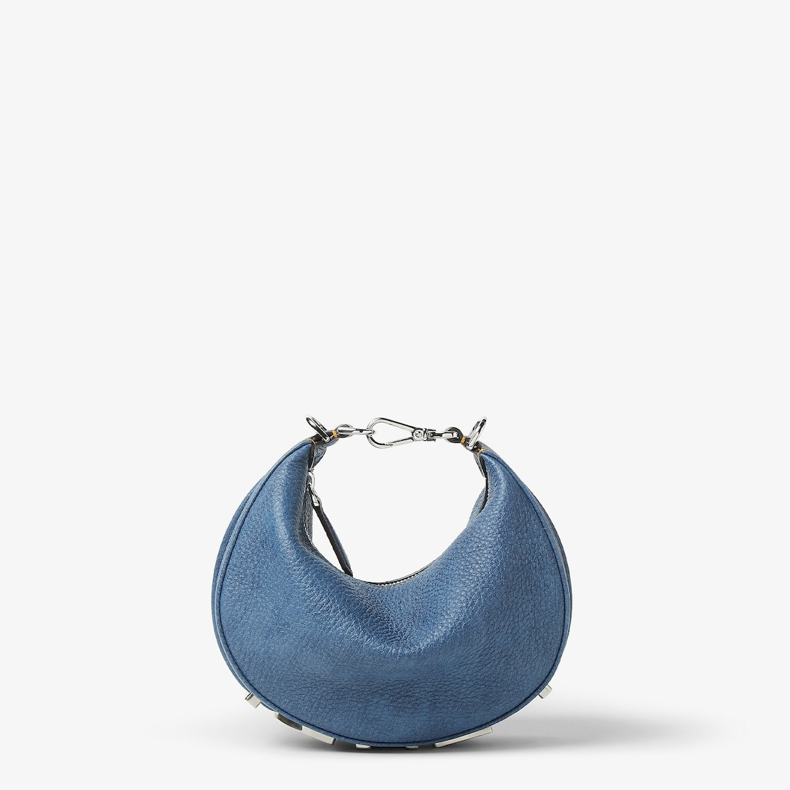 Mini Fendigraphy hobo bag with a contemporary look and bold details. Crafted from blue Cuoio Romano leather, a calfskin with a distinctive natural grain, a material produced using a metal-free tanning process and featuring a unique denim-effect finish. Embellished with contrasting stitching in yellow yarn and decorated with the FENDI lettering in vintage palladium metal on the base, visible when the bag is carried. Zipper closure with a lined internal compartment, palladium-finish metalware. It can be carried by hand by closing the bag with the clip or worn on the shoulder or cross-body using the adjustable, detachable blue leather shoulder strap inserted inside the side attachment points. Holds a 6.2-inch smartphone, Mini Trifold card holder or wallet, keys and lipstick. Made in Italy Composition: 100% calf leather, inside: 63% cotton, 34% polyester, 3% acrylic Product Code: 8BS081AUSZF1KGV