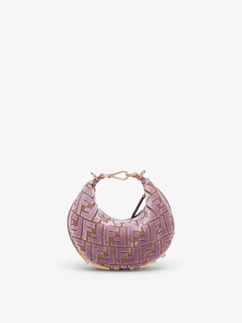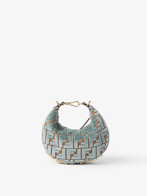 Mini Fendigraphy hobo bag with a contemporary look and bold details. Made of jacquard velvet with embossed FF motif in matcha green on a beige base, decorated with vintage gold-finish metal FENDI lettering on the base, visible when the bag is worn. Zipper closure and fabric-lined internal compartment, matcha green calfskin details and gold-finish metalware. It can be carried by hand by closing the bag with the clip, or worn on the shoulder or cross-body using the adjustable, detachable shoulder strap inserted inside the side attachment points. Holds a 6.2-inch smartphone, Mini Trifold card holder or wallet, keys and lipstick. Made in Italy Composition: 39% polyester, 35% cotton, 25% viscose, 1% other fibers, inside: 63% cotton, 34% polyester, 3% acrylic Product Code: 8BS081AT14F1SKB
