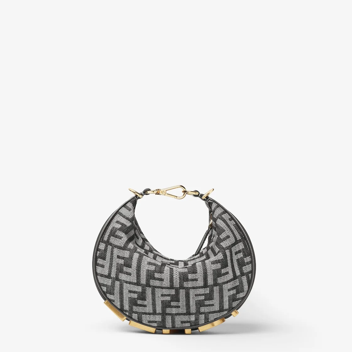 Mini Fendigraphy hobo bag with a contemporary look and bold details. Made of denim-effect FF jacquard in shades of dark blue, decorated with vintage gold metal FENDI lettering on the base, visible when the bag is worn. Zipper closure and lined internal compartment, dark blue calfskin details and gold-finish metalware. It can be carried by hand by closing the bag with the clip, or worn on the shoulder or cross-body using the adjustable, detachable shoulder strap inserted inside the side attachment points. Holds a 6.2-inch smartphone, Mini Trifold card holder or wallet, keys and lipstick. Made in Italy Composition: 34% cotton, 27% polyamide, 21% polyurethane, 18% polyester, 100% calf leather, inside: 63% cotton, 34% polyester, 3% acrylic Product Code: 8BS081AUT4F1UJ7