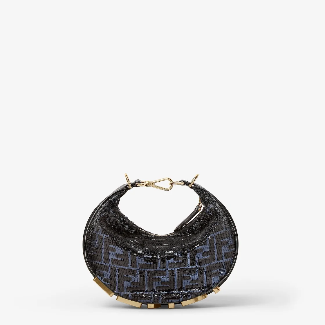 Mini Fendigraphy hobo bag with a contemporary look and bold details. Entirely embroidered with blue and black sequins that depict the iconic FF motif. Trimmed with black calfskin and decorated with vintage gold-finish metal FENDI lettering on the base, visible when the bag is worn. Zipper closure with a lined internal compartment, gold-finish metalware. Can be carried by hand by closing the bag with the clip or worn on the shoulder or cross-body using the adjustable, detachable black leather shoulder strap inserted inside the side attachment points. Holds a 6.2-inch smartphone, Mini Trifold card holder or wallet, keys and lipstick. Made in Italy Composition: 63% cotton, 34% polyester, 3% acrylic, 100% calfskin, inside: 100% polyester Product Code: 8BS081AVTAF1UK4