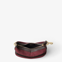 Mini Fendigraphy hobo bag with a contemporary look and bold details. Made of soft dark brown nappa leather and burgundy suede, inlaid to create a chevron motif. Embellished with FENDI lettering in vintage gold metal on the base, visible when the bag is carried. Zipper closure with fabric-lined internal compartment, gold-finish metalware. It can be carried by hand by closing the bag with the snap hook or worn on the shoulder or cross-body using the adjustable, detachable dark brown calfskin shoulder strap inserted inside the side attachment points. Holds a 6.2-inch smartphone, Mini Trifold card holder or wallet, keys and lipstick. Made in Italy Composition: 100% lamb leather, interior: 63% cotton, 34% polyester, 3% acrylic Product Code: 8BS081AYDRF1U3F
