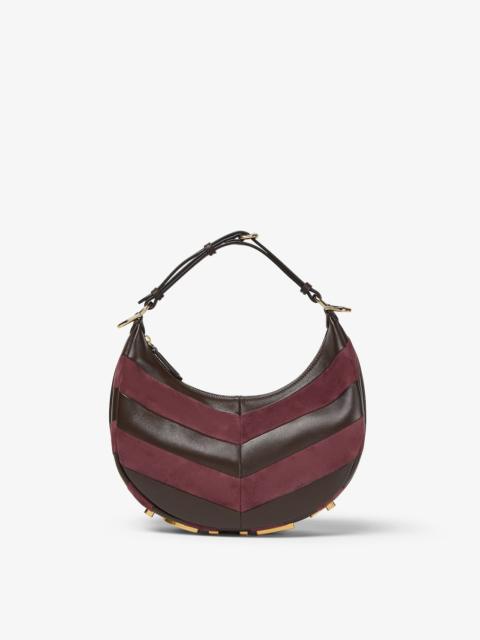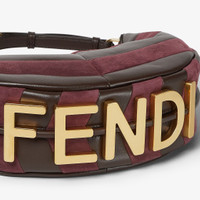 Small Fendigraphy hobo bag with a contemporary look and bold details. Made of soft dark brown nappa leather and burgundy suede, inlaid to create a chevron motif. Embellished with FENDI lettering in vintage gold finish metal on the base, visible when the bag is worn under the arm. Zipper closure with fabric-lined internal compartment, gold-finish metalware. It can be worn on the shoulder thanks to the adjustable, detachable, dark brown calfskin handle. Comes with hooks that allow a shoulder strap to be attached for wearing cross-body. Made in Italy Composition: 100% lamb leather, inside: 100% polyester Product Code: 8BR798AYDRF1U3F