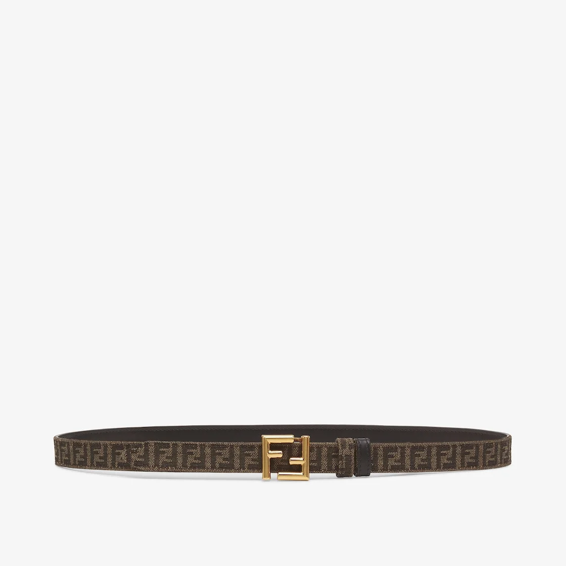 Reversible belt with loop and FF stud buckle. Made of black leather on one side and brown and tobacco FF jacquard fabric on the other side. Metal accessories in a vintage-gold finish. Made in Italy Measurements: - Width : 2 cm Composition: 100% calf leather, 62% polyester, 33% cotton, 5% resins Product Code: 8C0719ARN1F1OQ1