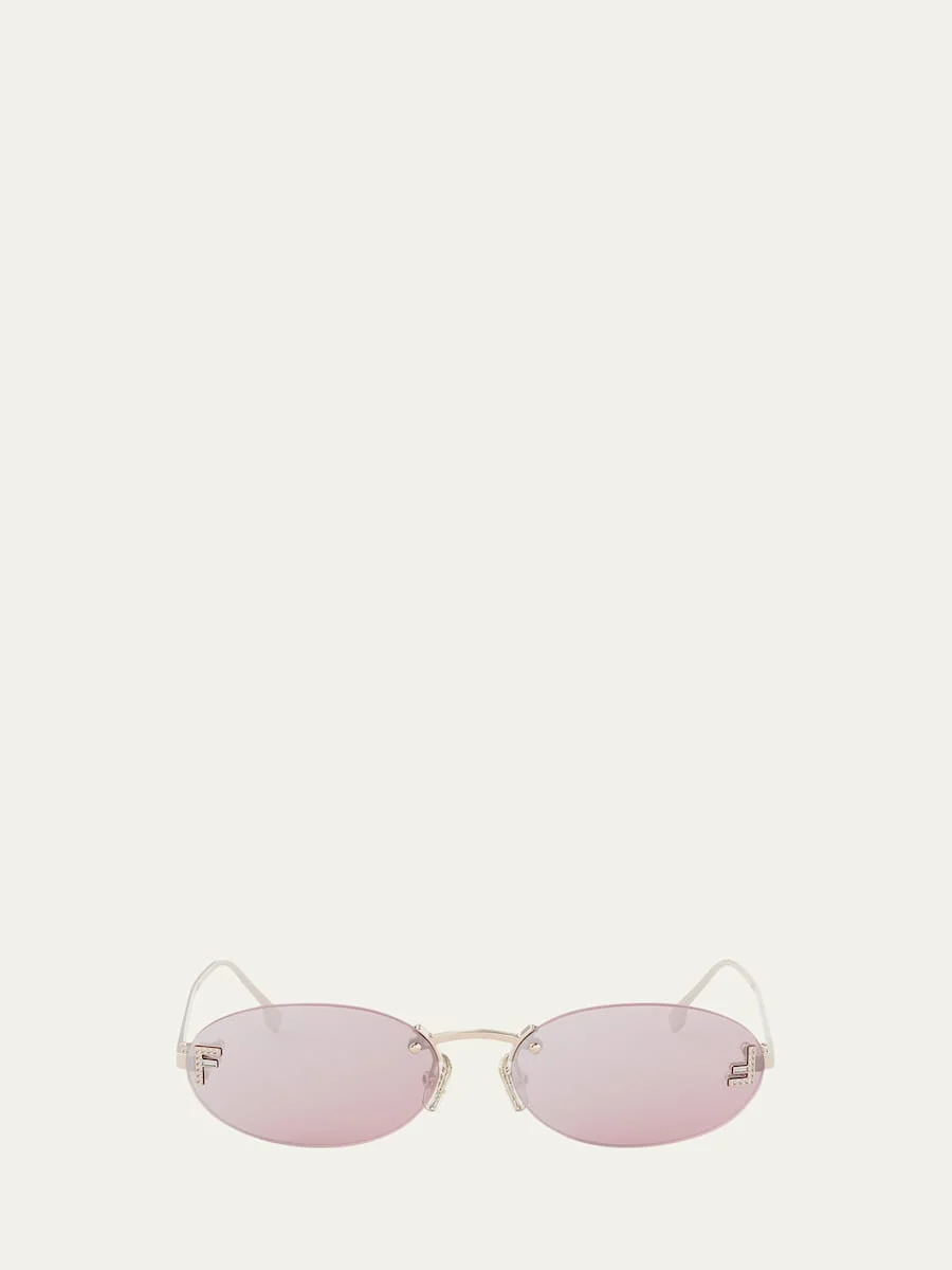 Fendi rimless oval sunglasses in metal FF crystals on the front side of the lenses Lens/bridge/temple (in mm): 54-15-135 Solid-color lenses Adjustable nose pads Thin, tapered arms Hand wash 100% UVA/UVB protection Made in Italy Proposition 65 warning for California residents This product contains perfluoroalkyl and polyfluoroalkyl substances (PFAS). For more information, please visit the manufacturer’s website. Online Inquiries: BGS21_D5183| Store Inquiries: #4879288
