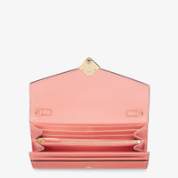 FF Diamonds continental wallet with geometrically shaped flap, diagonal FF logo and fine, removable chain strap. The interior is laid out like a wallet with two gusseted compartments, a zipper pocket, two flat pockets and ten card slots. Made of pink calf leather with a tone-on-tone leather flap. Gold-finish metalware. Made in Italy Composition: 100% calf leather, inside: 50% cotton, 42% polyamide, 8% resin Product Code: 8M0365ALV4F1PJ7