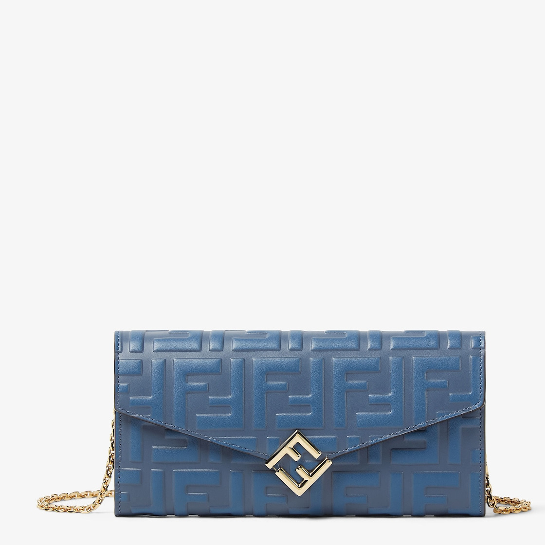 FF Diamonds continental wallet with geometrically shaped flap, diagonal FF logo and fine, removable chain strap. The interior features a wallet layout with two gusseted compartments, a zipper pocket, two flat pockets and ten card slots. Made of calfskin with the embossed FF motif in blue. Gold-finish metalware. Made in Italy Composition: 100% calf leather, inside: 50% cotton, 42% polyamide, 8% resins Product Code: 8M0365AS42F1SXT