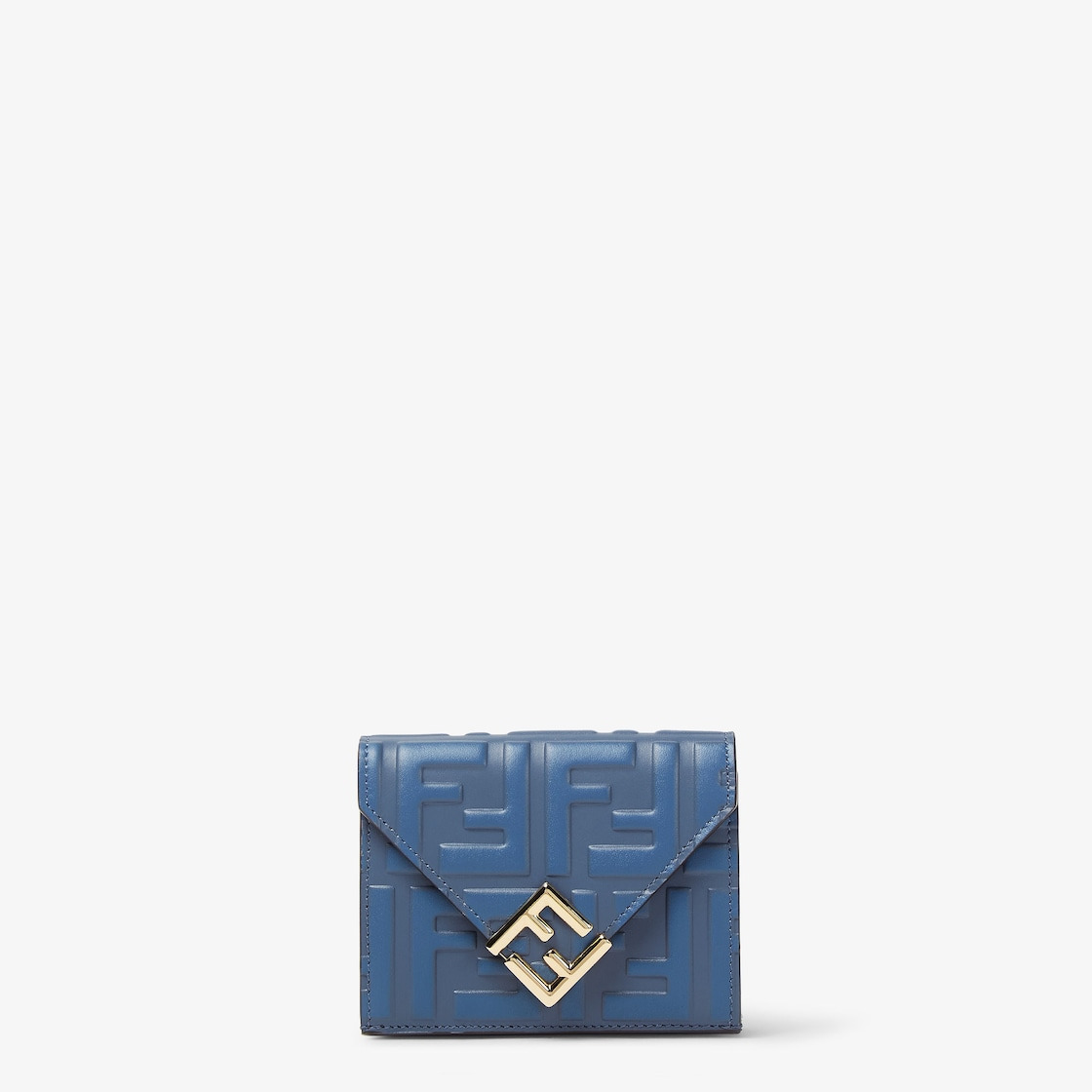 FF Diamonds medium tri-fold wallet. Divided into six card slots, a bill compartment and a coin pocket with a snap button. Made of calfskin with the iconic embossed FF motif in blue. Gold-finish metalware. Made in Italy Composition: 100% calf leather, inside: 50% cotton, 42% polyamide, 8% resins Product Code: 8M0480AS42F1SXT