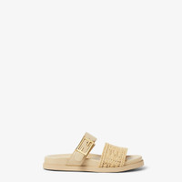 Double-band flat slides with FF Baguette decorative buckle. Made of beige leather with front mesh band and FF motif in braided, perforated viscose raffia. Gold-finish metalware. Made in Italy Composition: 50% polyester, 50% viscose, lining: 100% polyamide Product Code: 8X8710AU2RF1SVU