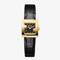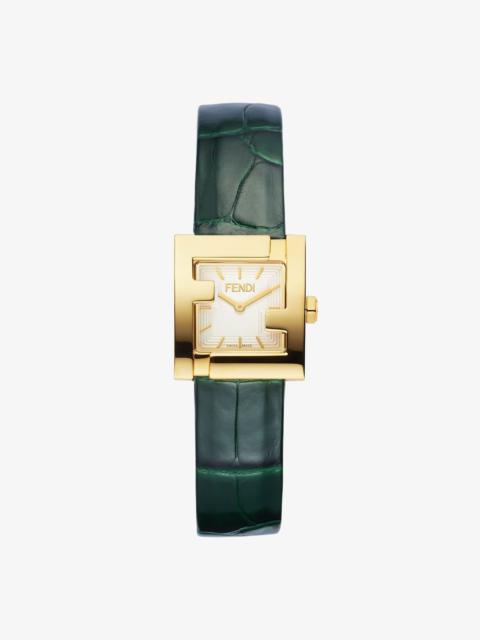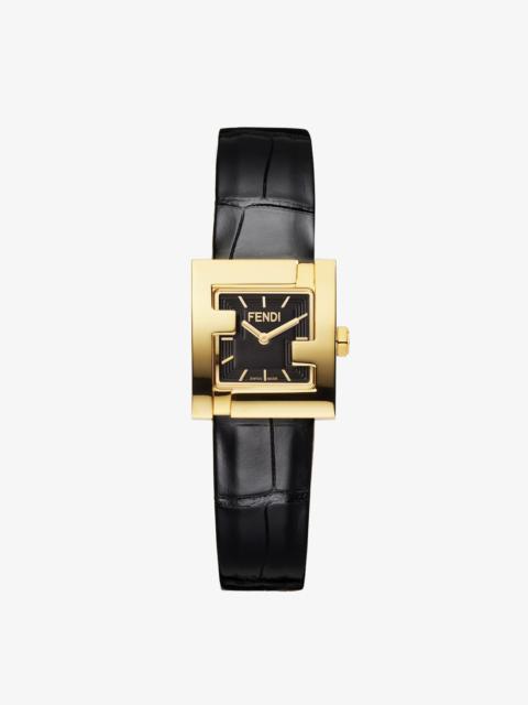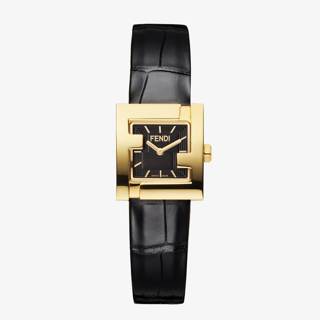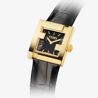 Square case in the shape of the FF motif in gold-colored polished stainless steel. Crown with embossed FF logo and gold-colored PVD coating. Black lacquer face, gold-plated radius-cut gold-colored indices and gold FENDI lettering. Shiny black alligator leather bracelet, 14/12 mm, with a pin buckle. Composition: 100% yellow IP steel, 100% alligator leather Product Code: FOW988AQ2TF0ABB Instruction Manual: