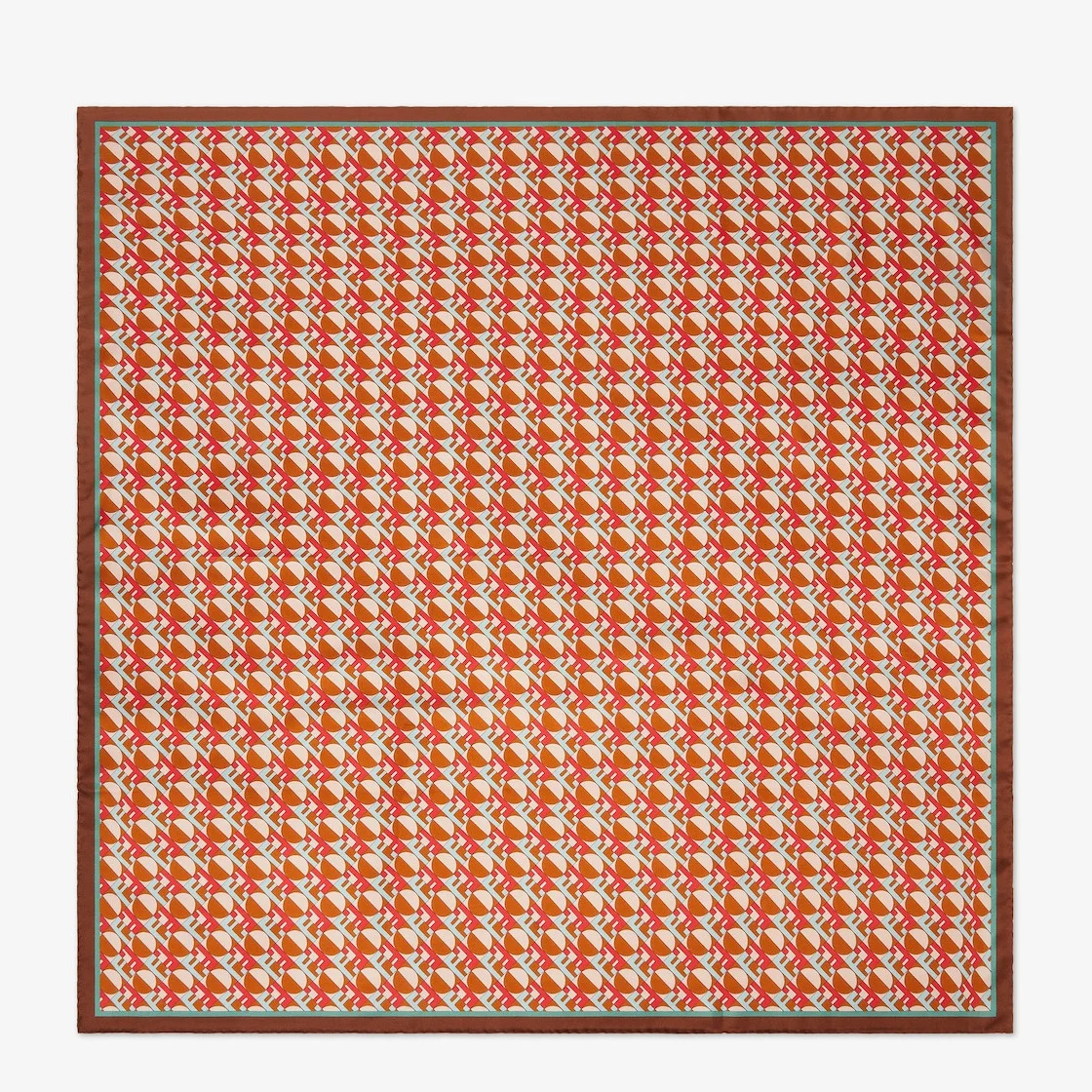 Square foulard made of silk with Fendi Optical geometric motif printed all over with a brown and red three-dimensional effect. The design is enhanced by a striped color-block frame. Hand-rolled hems. Made in Italy Composition: 100% silk Product Code: FXT091AYLAF1USV