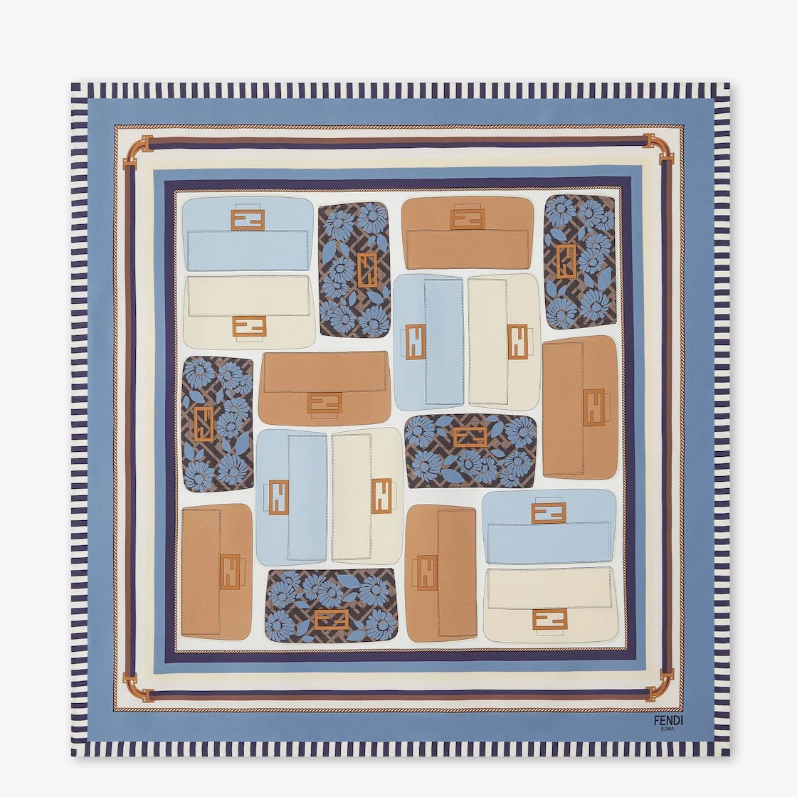 Square foulard made of silk twill. Customized with a Fendi Baguette Flowers motif printed in the centre in light blue and beige, framed by color-block stripes reminiscent of iconic Pequin stripes. Hand-rolled hems. Made in Italy Measurements: - Height : 90 cm - Width : 90 cm Composition: 100% silk Product Code: FXT091ASQFF1P2O