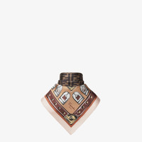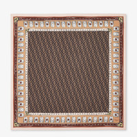 Square silk foulard. The timeless FF print portrays some of the brand’s most iconic elements. Baguette and Peekaboo are enclosed within small arches decorating the edge of the design. Hand-rolled hems. Made in Italy Measurements: - Height : 90 cm - Width : 90 cm Composition: 100% silk Product Code: FXT091AQD6F1N3I
