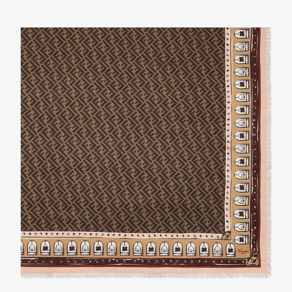 Large square shawl made of a soft wool and silk blend. The timeless FF print frames some of the brand’s most iconic elements. Baguette and Peekaboo are enclosed within small arches decorating the edge of the design. Finished with hand-frayed hems. Made in Italy Composition: 90% modal, 10% cashmere Product Code: FXT069AQD7F1N3I