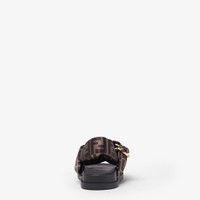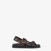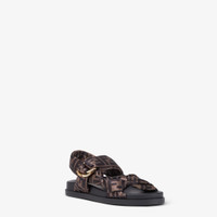 Sandals with padded straps and decorative D-ring buckle with three-dimensional Fendi lettering. Made of satin with iconic FF motif. Black leather insole, rubber sole. Gold-finish metalware. Made in Italy Composition: 97% polyester, 3% elastane, inside: 100% calfskin Product Code: 8X8772AE7SF0R7V