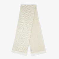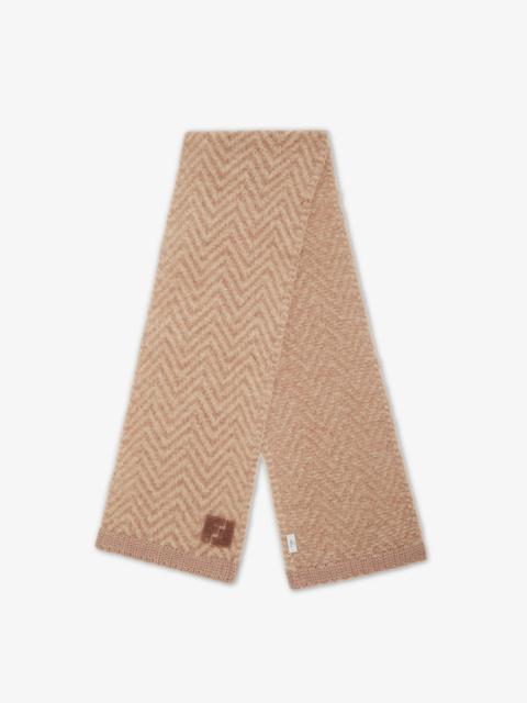 Rectangular scarf in ivory-colored soft alpaca wool. The Chevron knit with brushed finish gives a soft, flowing texture, while the wool knit trim is worked in a fisherman’s rib knit. Embellished with 3D-effect FF detail on the end, in tone-on-tone brushed alpaca. Made in Italy Composition: 52% alpaca, 28% fleece wool, 20% polyamide, material 2: 100% wool Product Code: FXT458AYKMF0QM0
