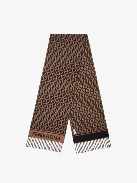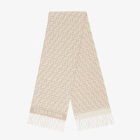 Scarf made of wool yarn and cashmere with an all-over ivory and beige jacquard FF motif. Embellished with Fendi Roma logo and fringes on the ends. Made in Italy Composition: 80% fleece wool, 20% cashmere Product Code: FXT113AQCWF0QB9