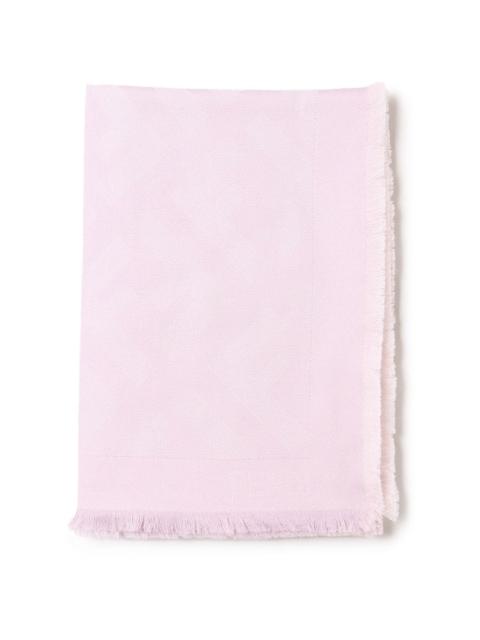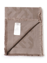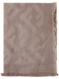 wool-cashmere scarf Highlights - Taupe grey - Wool-cashmere blend - Jacquard logo motif - Ff motif - Fringed edge Made in Italy Composition Wool 100% SIZE & FIT Measurement LENGTH 55.11 in(140 cm) WIDTH 55.11 in(140 cm) Washing instructions Read Manufacturer Guidelines