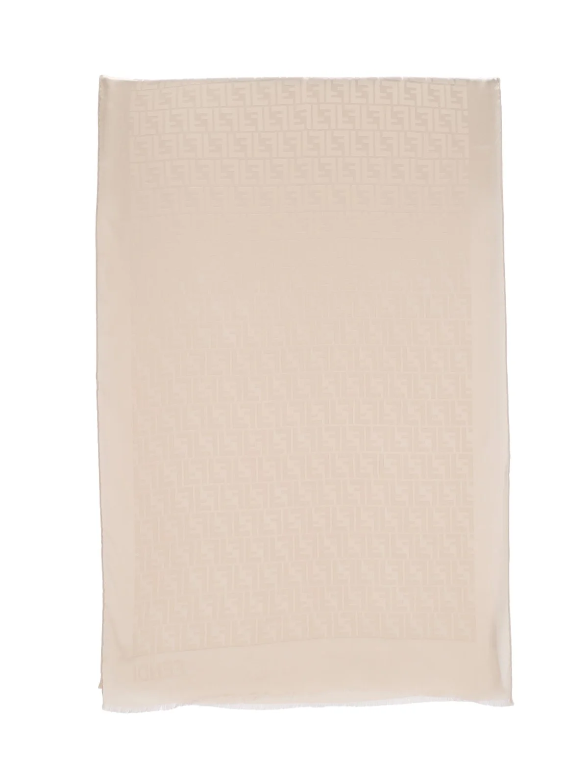 FENDI 'FF' CREAM SILK SHAWL WITH ALL-OVER "FF" MONOGRAM LOGO PATTERN, SQUARE DESIGN, FRINGED TRIMS, INNER LABEL DETAIL. PRODUCT INFO PRODUCT CODE FXT185 ANBEF10X5 COMPOSITION: 100% SILK SIZE AND FIT: H 140 X W 140 CM MADE IN: ITALY