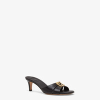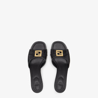 Sandals with square toes, two wrap-around bands and a metallic FF motif. The unusual design allows the style to be folded so it conveniently takes up less space. Made of black leather. Gold-finish metalware. Made in Italy Measurements: - Heel height : 55 mm Composition: 100% calf leather, inside: 100% lamb leather Product Code: 8R8538NA7F0QA1
