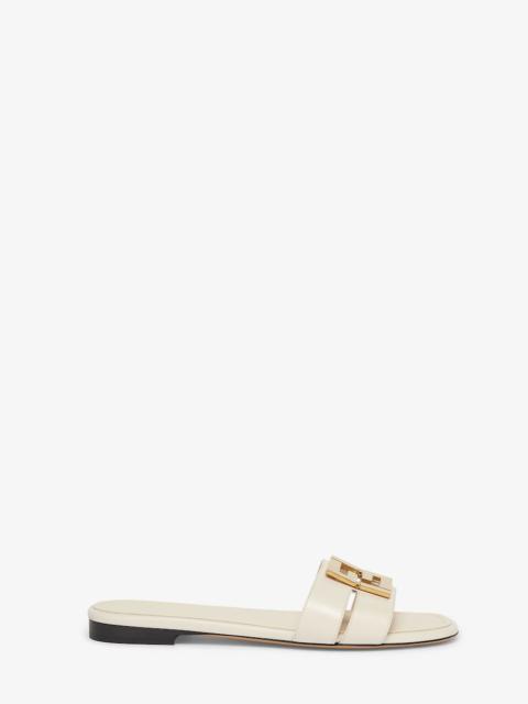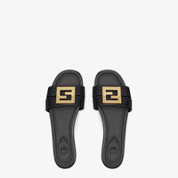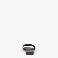 Flat sandals with square toes, two wrap-around bands and a metallic FF motif. The distinctive design adapts to the shape of the foot and is extremely comfortable. Made of black leather. Gold-finish metalware. Made in Italy Measurements: - Heel height : 5 mm Composition: 100% calf leather, interior: 100% lamb leather Product Code: 8R8554NA7F0QA1