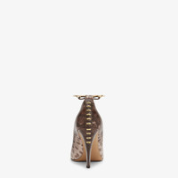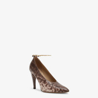 Fendi Filo pumps with tapered rounded toe and metallic ankle strap. Heel decorated with metallic Selleria stitching. Made of beige karung leather. Gold-finish metalware. Made in Italy Measurements: - Heel height : 95 mm Composition: 100% karung snake leather, interior: 100% goat leather Product Code: 8I8498VMGF0QB9