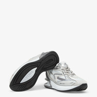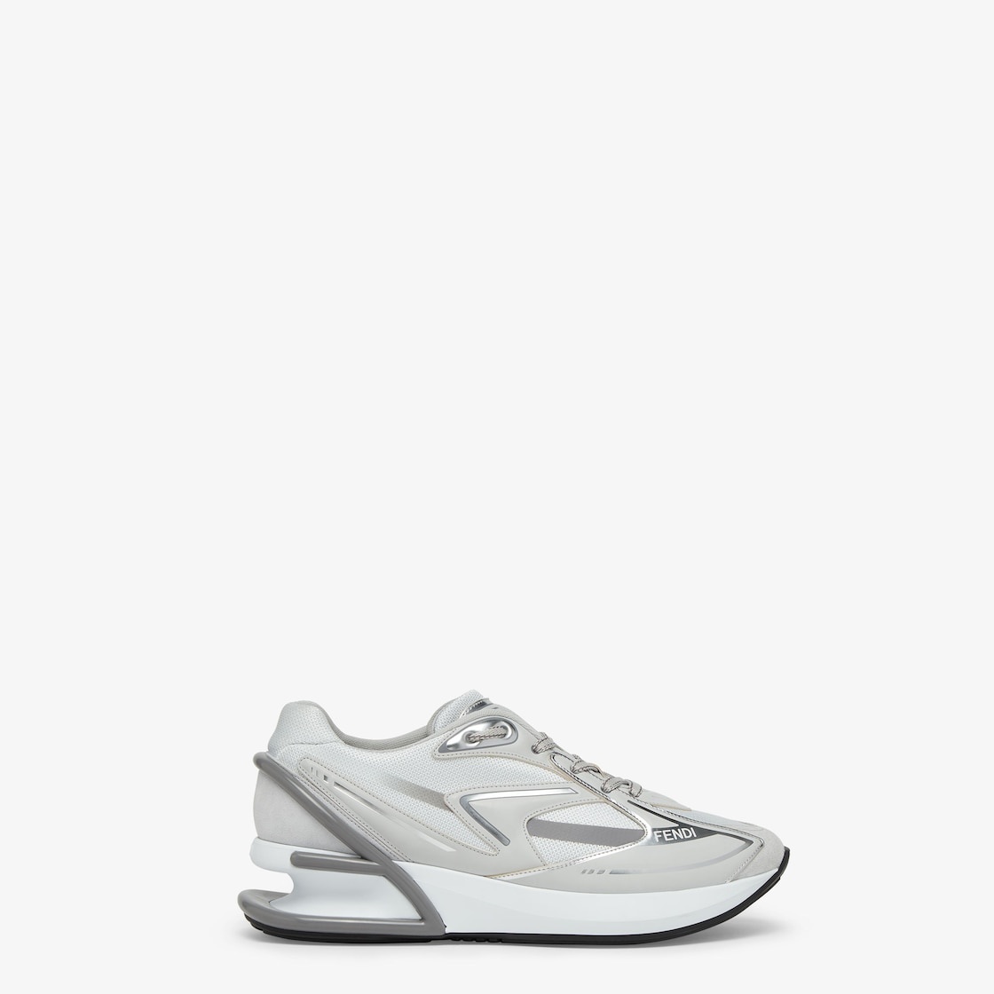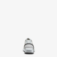 First 1 sneakers with laces and diagonal F-shaped sculpted corrugated soles. Made of light gray and white tech fabric. Framilon inserts. Customized with screen-printed Fendi lettering on the tongue and the side. Made in Italy Measurements: - Heel height : 30 mm Composition: Main material: 100% polyester, 100% calf leather, lining: 100% polyamide, 100% polyester Product Code: 8E8452AQ70F1MEP