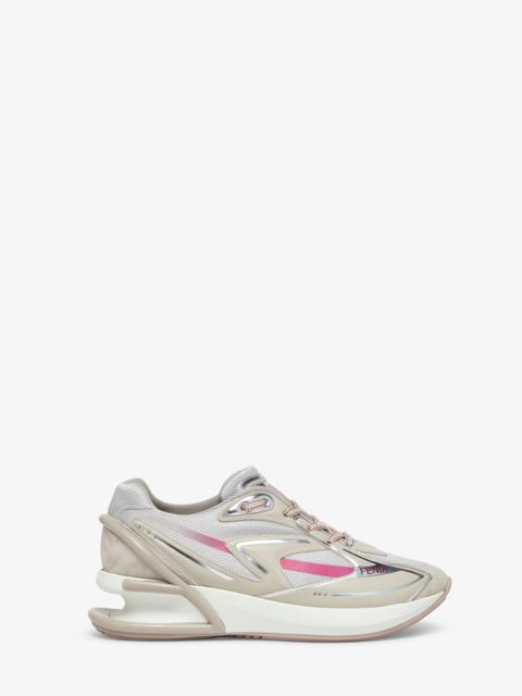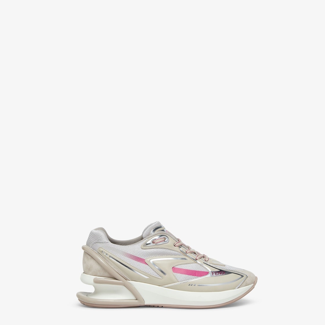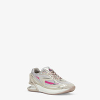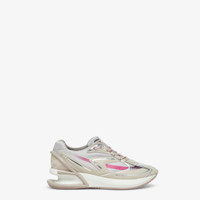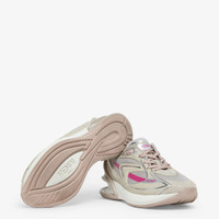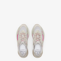 First 1 sneakers with laces and diagonal F-shaped sculpted corrugated soles. Made of beige and pink tech fabric. Framilon inserts. Customized with screen-printed Fendi lettering on the tongue and the side. Made in Italy Measurements: - Heel height : 30 mm Composition: Main material: 100% polyester, 100% calf leather, lining: 100% polyamide, 100% polyester Product Code: 8E8452AQ70F1MES