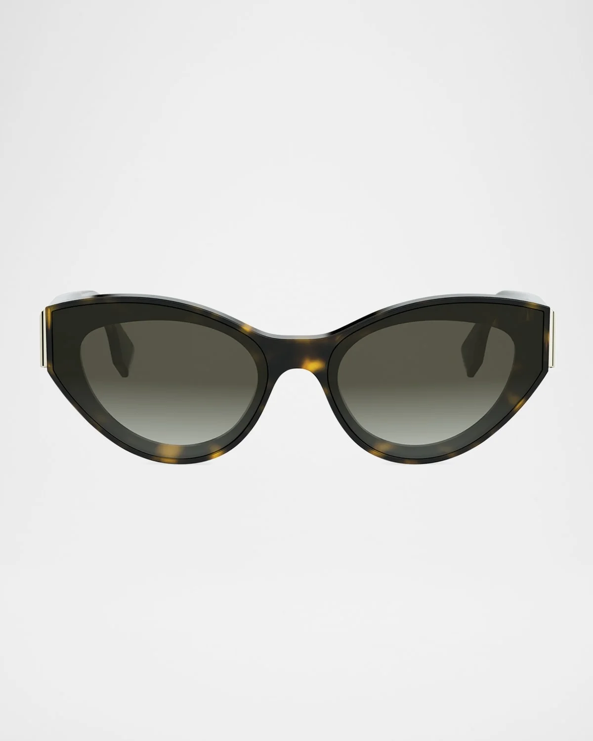 Fendi "Fendi First" sunglasses in Dark Havana acetate, embellished with the line's signature oversized, diagonal metal F motif at the temples Lens/bridge/temple (in mm): 6215140 Cateye frames Gradient lenses Acetate nose pads Wide, tapered arms 100% UVA/UVB protection Made in Italy