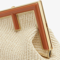 Small Fendi First bag made of natural-colored straw with a moss stitch-texture weave and oversized metal F clasp bound in brown nappa leather. Featuring an interior compartment lined in fabric with the iconic FF motif, pull-out internal attachment points and gold-finish metalware. Can be carried by hand as a clutch or worn on the shoulder thanks to the removable brown leather shoulder strap. Made in Italy Measurements: - Height : 18 cm - Depth : 9.5 cm - Width : 26 cm - Weight : 1.01 kg Composition: mainmaterial:52%cotton, 48%canapa, material1:62%cotton, 38%polyester, material2:100%lambleather, inside:27%polyester, 27%polyamide, 27%polyuret Product Code: 8BP129APG8F1LMM