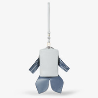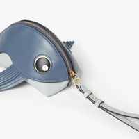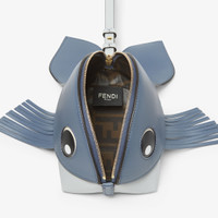 Fish-shaped toiletry case with zipper closure, sided fringes and shaped tail. Made of blue and pearl gray calfskin. The leather zipper pull is also a practical handle for you to carry your toiletry case by hand. Gold-finish metalware. Made in Italy Composition: 100% calf leather Product Code: 8N0212AV2GF1T91