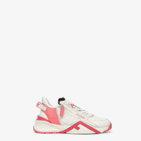 Fendi Flow sneakers with adjustable elastic laces and side zip fastening. Branded with FF pattern on the tongue and rubber tab with embossed logo on the back of the heel. Made of white leather. Tone-on-tone FF fabric details. 35 mm rubber running sole with pink diagonal F detail. Made in Italy Composition: mainmaterial:100%calfleather, 65%polyester, 35%polyurethane, inside:100%polyester Model height: null Size worn: null Measurements: - Heel height : 30 mm Product Code: 8E8035AO0ZF1LRP