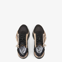 Fendi Flow sneakers with adjustable elastic laces and side zipper closure. Customized with FF pattern on the tongue and rubber tab with embossed logo on the back of the heel. Made of nylon, suede and LYCRA® in black. Rubber details. 35 mm rubber running sole with pink diagonal F detail. Made in Italy Measurements: - Heel height : 30 mm Composition: 100% polyamide, material 2: 100% calf leather, inside: 100% polyester Product Code: 8E8035AF5RF08M4