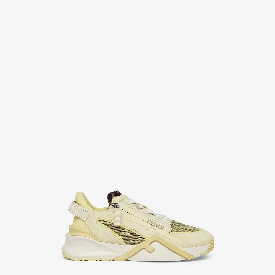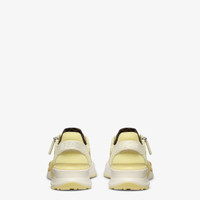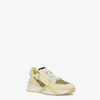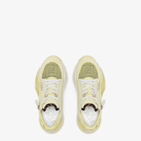 Slip-on sneakers with elastic laces, side zipper and corrugated sole with engraved F. Fendi Flow lettering embossed on the heels. Made of pale yellow suede with yellow FF mesh inserts. Embellished with Lycra® details with an FF motif. Lightweight white rubber soles with pale yellow diagonal F detail. Made in Italy Measurements: - Heel height : 30 mm Composition: 100% calf leather, 35% polyamide, 50% polyester; 15% thermoplastic polyamide, inside: 100% polyester Product Code: 8E8458ARIXF1P85