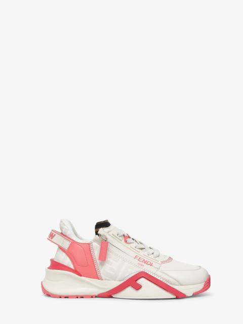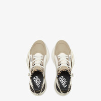 Fendi Flow sneakers with adjustable elastic laces and side zip fastening. Branded with FF pattern on the tongue and rubber tab with embossed logo on the back of the heel. Made of beige leather. FF fabric detailing. 35 mm white rubber running sole with diagonal F detail. Made in Italy Measurements: - Heel height : 30 mm Composition: 100% calfskin, 55% cotton, 45% polyamide, coating: 100% resin, inside: 100% polyester Product Code: 8E8035AJZHF1MDC