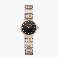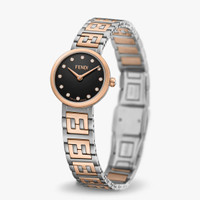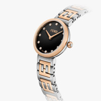 Polished and brushed stainless steel case, rose gold-colored stainless steel bezel and crown, crown set with one diamond, approximately 0.02 carats. Black lacquered dial set with 12 diamonds, approximately 0.03 carats, rose-gold hands. Satin-finish stainless steel bracelet with rose gold-colored polished central links with FF logo and folding buckle. Composition: 100% stainless steel, 100% mother of pearl, 100% diamonds (13 stones ~0.05 carats) Product Code: FOW829A85GF0QA1 Instruction Manual: